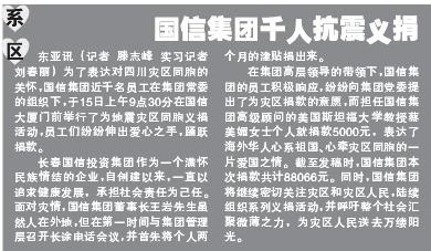 长春国信投资集团作为一个满怀民族情结的企业,自创建以来,一直以追求健康发展,承担社会责任为己任。面对灾情,国信集团董事长王岩先生虽然人在外地,但在第一时间与集团管理层召开长途电话会议,并首先将个人两个月的津贴捐出来。
