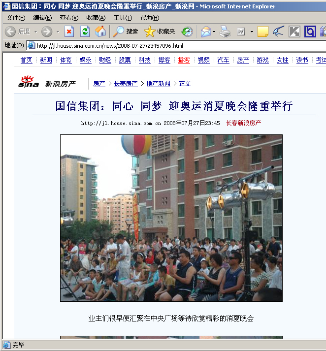在消夏晚会上长影世纪村社区文体队伍、国信客服中心、国信物业公司演出了精彩的自编迎奥运节目,演出不断迎来观众的热烈掌声,社区到处呈现出一片祥和的气氛。居住在社区的外国朋友也来参加了观看和演出,社区中近千名居民参加了消夏晚会。